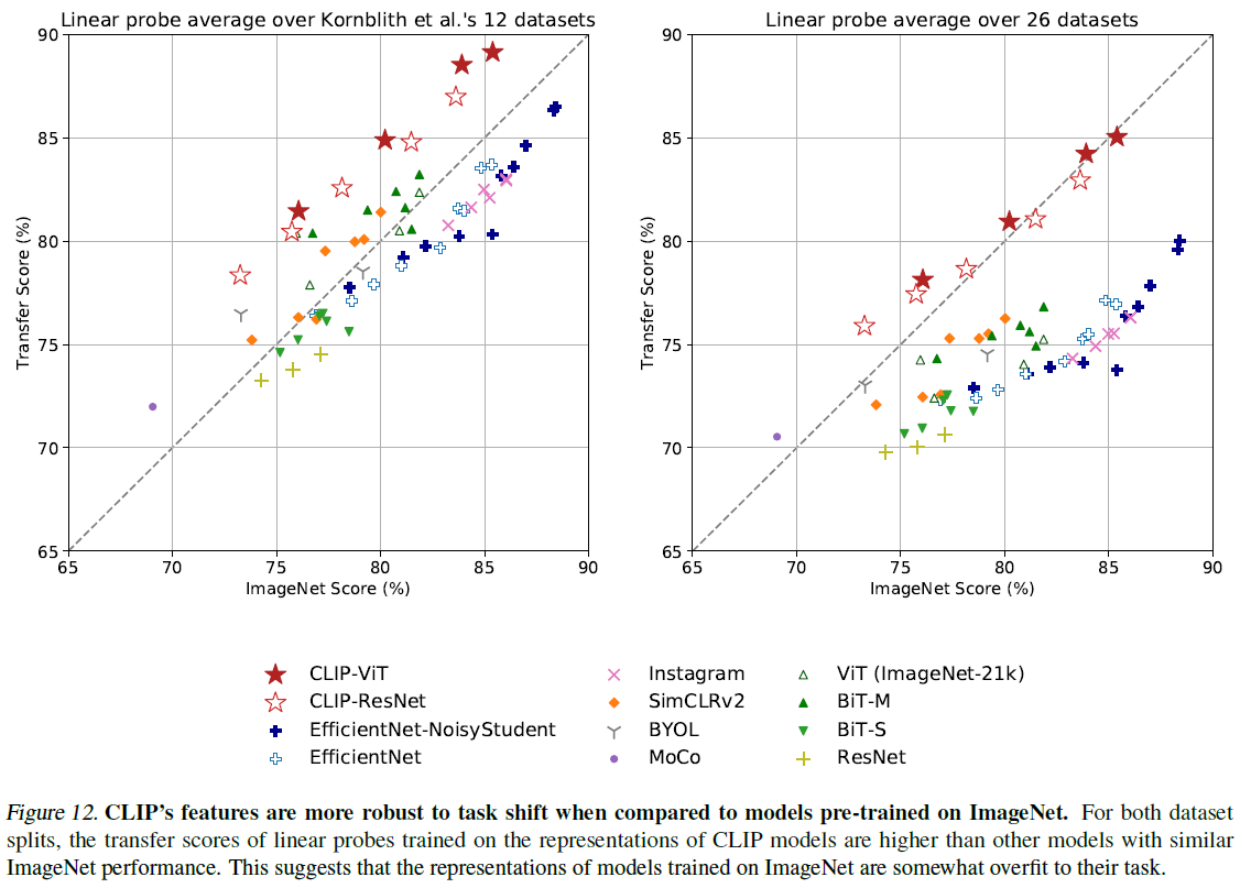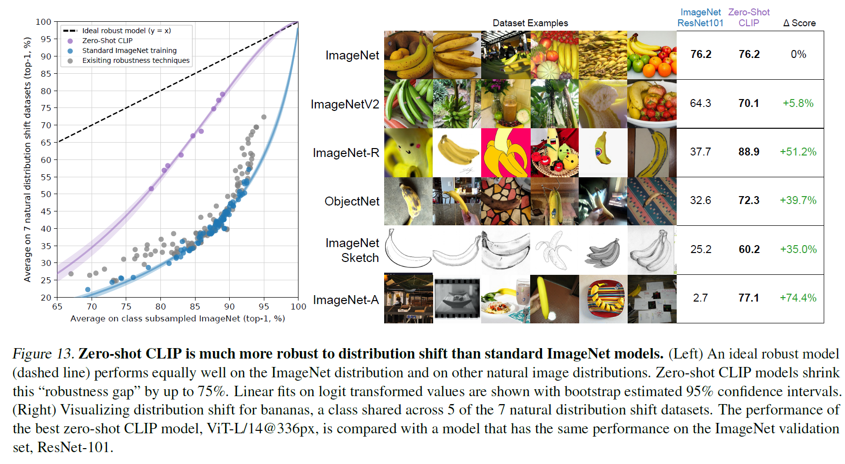 여러 benchmark를 통해 zero shot transfer performance를 평가하였고, linear probe representation 학습의 효율성을 검증하였다. 추가로 zero shot CLIP model의 robustness 또한 평가하였다.