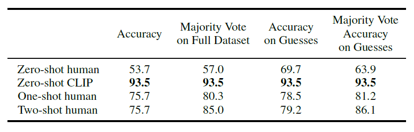 인간은 zero shot일 때는 매우 낮은 결과를 보여준다. 하지만 하나의 예시를 알게 되면, one-shot learning 을 하게 되면 자신이 모르는 것에 대해 인지하게 되어 좋은 결과를 보여주게 된다.