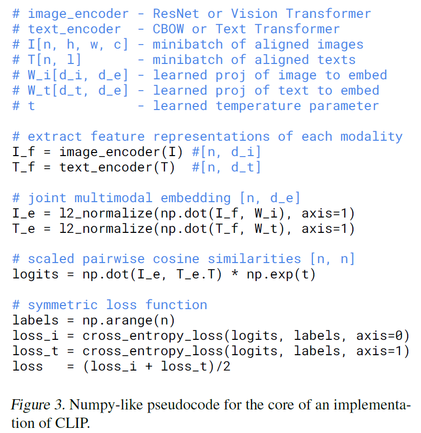N개의 batch로 구성된 image, text data를 만든다. 총 NxN pairing이 존재하게 된다. 이를 통해 CLIP는 정답 쌍 N개와 틀린정답 쌍 N2-N개를 학습하게 된다. 정답 쌍에 대해서는 cosine similarity를 maximize하고 , 틀린정답 쌍에 대해서는 cosine similarity를 minimize하는 방식으로 학습하게 된다. 이는 embedding하는 text encoder와 image encoder를 학습하는 것인데, multi-modal embedding space를 학습한다고 보면 된다.
