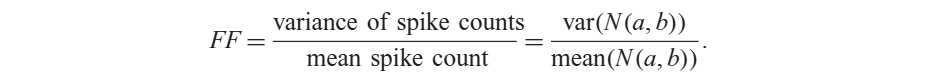 S = np.zeros((NumTrials, len(time))) # Spike Density Array 초기화 S[TrialNumbers, (SpikeTimes/dt).astype(int)] = 1/dtFano factor: Trial variability를 측정, ratio btw 분산과 평균