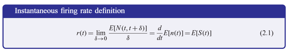 r(t): 시간 t에 뉴런이 발화할 확률, 단위 시간동안 스파이크 발생의 기대값.