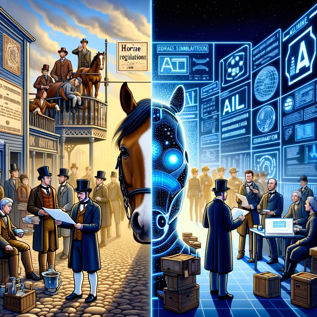 comparing regulations for horses and AI - DALLE 2023년 chat gpt의 등장 이후로 AI 규제에 대한 논의는 계속되었다. AI 규제와 관련된 정책 논의 또한 계속되었다.